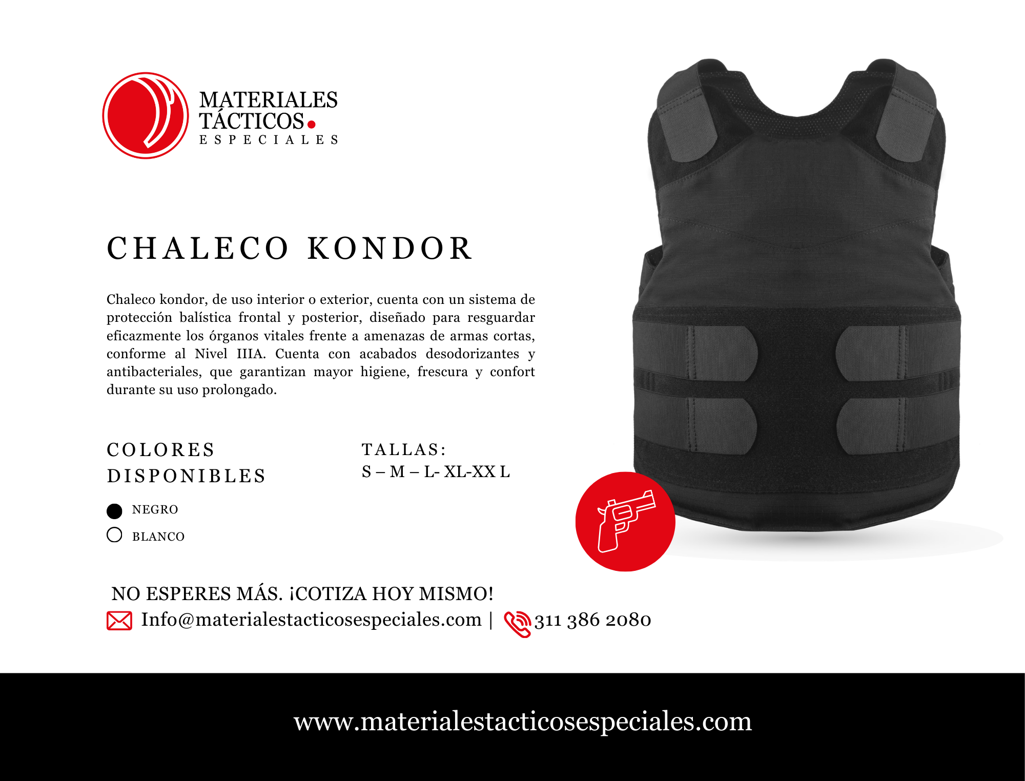 Chaleco kondor, de uso interior o exterior, cuenta con un sistema de protección balística frontal y posterior, diseñado para resguardar eficazmente los órganos vitales frente a amenazas de armas cortas, conforme al Nivel IIIA.