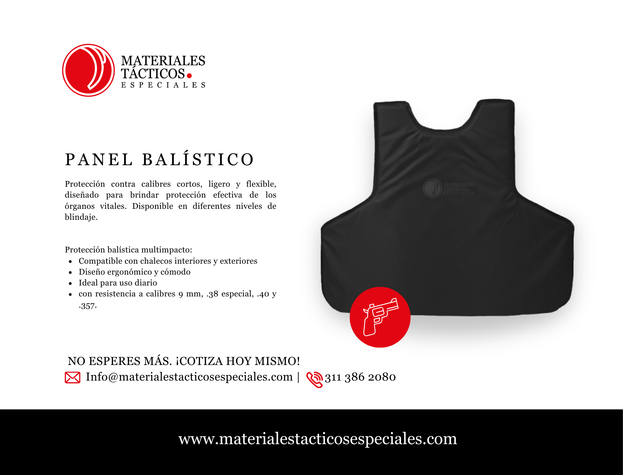 Panel protector ligero, disponibles en diferentes niveles de protección, resistencia a calibres 9mm, .38 especial, .40 y .357. Fabricado en materiales resistentes a impactos multiples. Ofrecen comodidad y son ideales para usar todo el día.